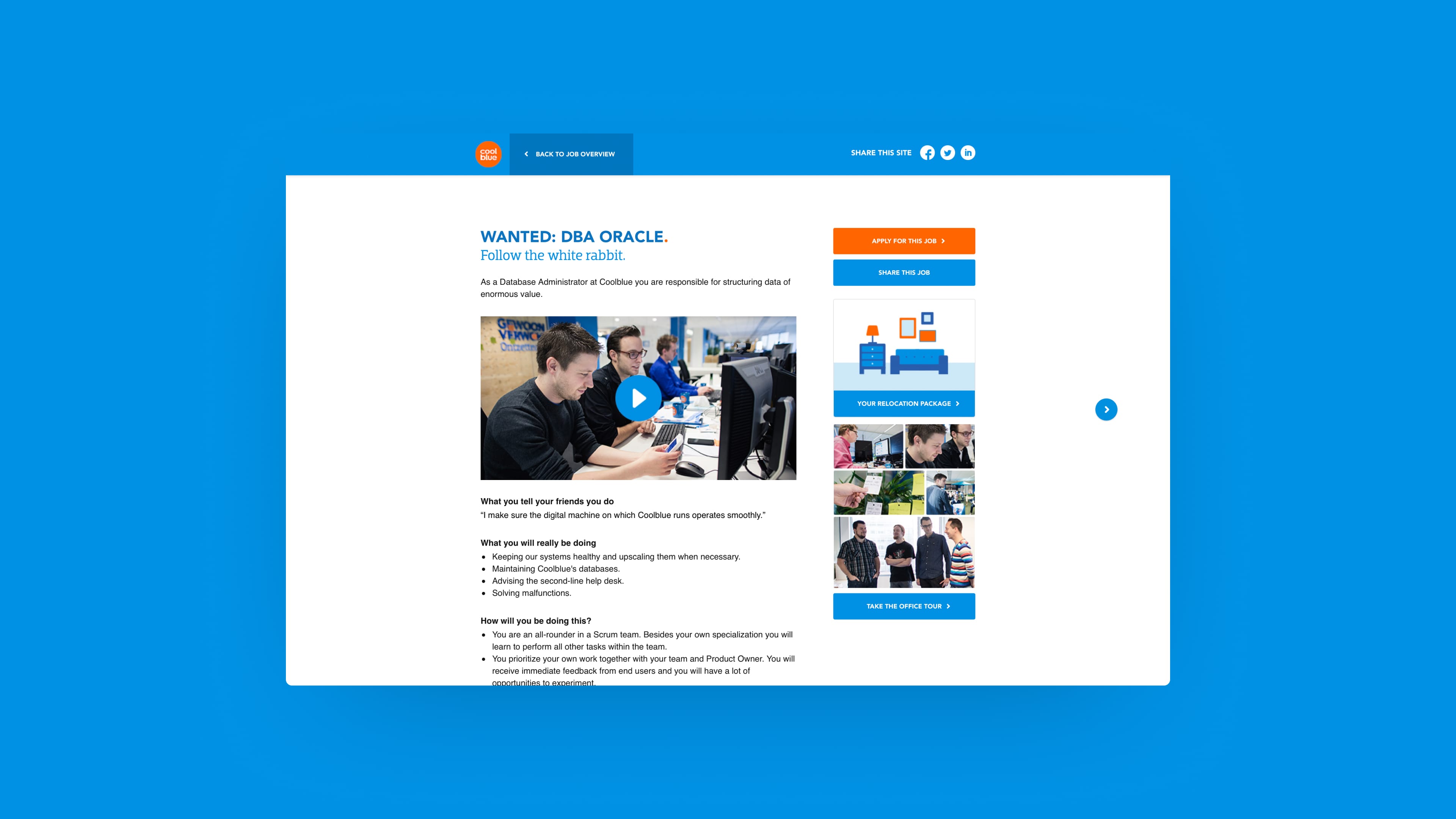 With each vacancy, a real Coolblue-er talks about the function so you'll get a good insight into how your day to day would be. Also with the Google Streetview feature, you'll get a virtual look into Coolblue's HQ which was a first in the Netherlands.