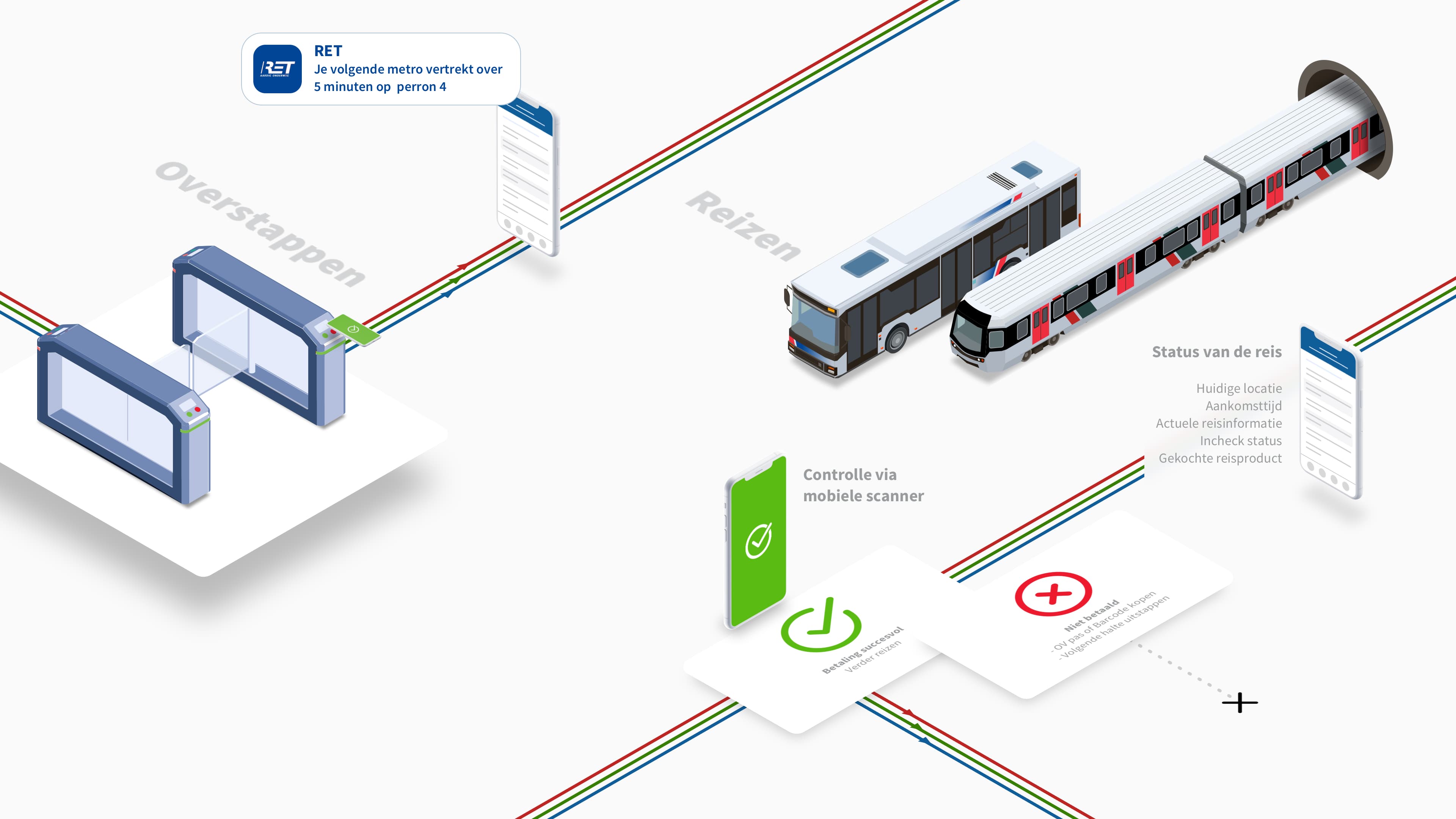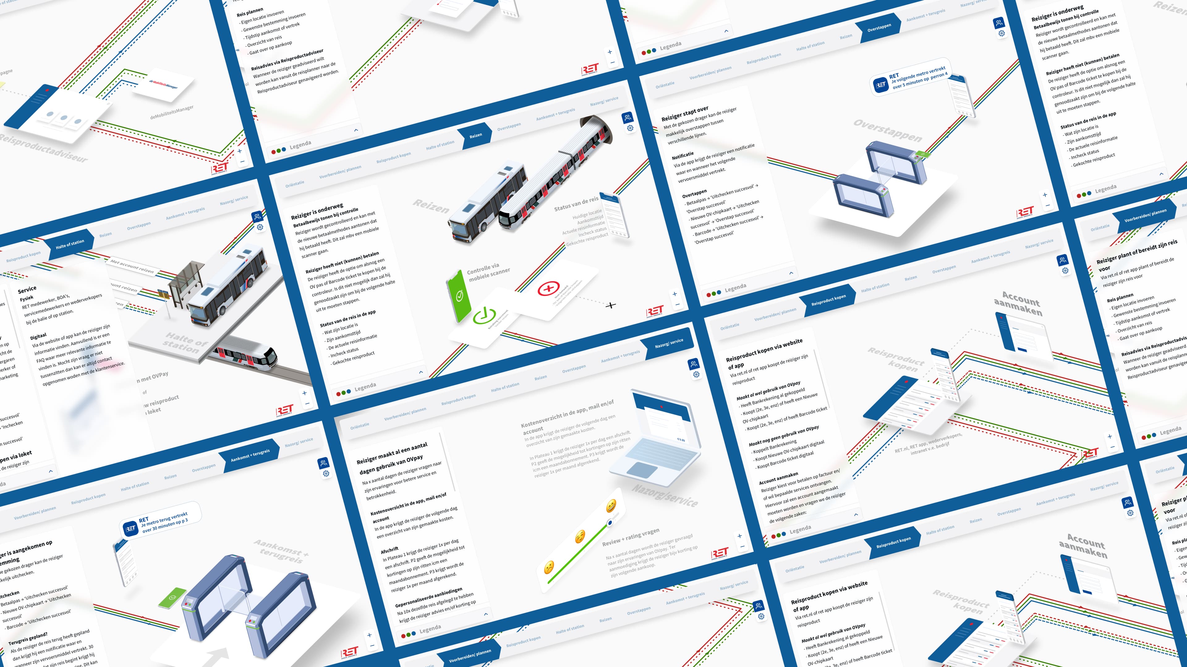 RET was integrating OVpay into their current systems. To ensure the smooth integration of all departments and systems, it was necessary to create a clear and concise map of the new payment method. We were asked to create an interactive tool that would visualize the customer journey, architecture, and external connections and systems.