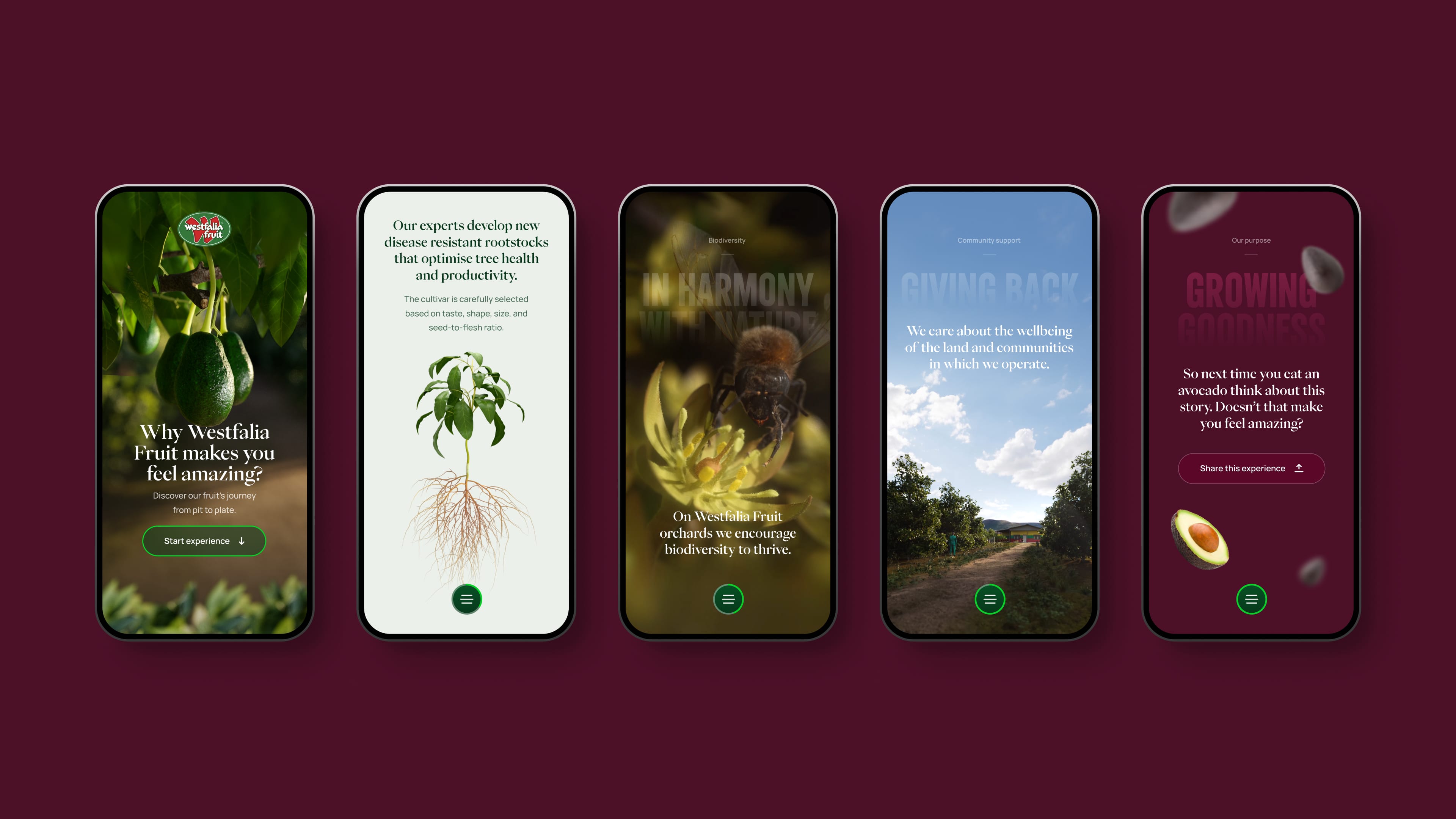 We also created an immersive, standalone experience page that uses visual storytelling to show how Westfalia Fruit sustainably grows high-quality avocados. Fully supported by animations, scrolling effects, and interactions, these story elements are brought to life in a truly memorable and captivating way.